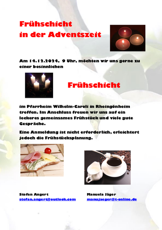 Am Samstag, 14.12.2024, 9 Uhr, möchten wir uns gerne zu einer besinnlichen Frühschicht im Pfarrheim Wilhelm-Caroli in Rheingönheim treffen.