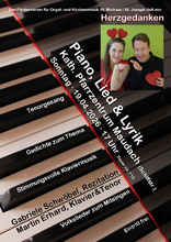 Seit mehr als zehn Jahren begeistern Gabriele Schwöbel (Rezitation) und Martin Erhard (Tenor & Pianist) ihr Publikum mit ihrer Reihe „Piano, Lied & Lyrik“. Zweimal im Jahr – im Frühjahr und im Herbst – präsentieren sie ein neues und ansprechendes Programm aus Musik und Poesie.